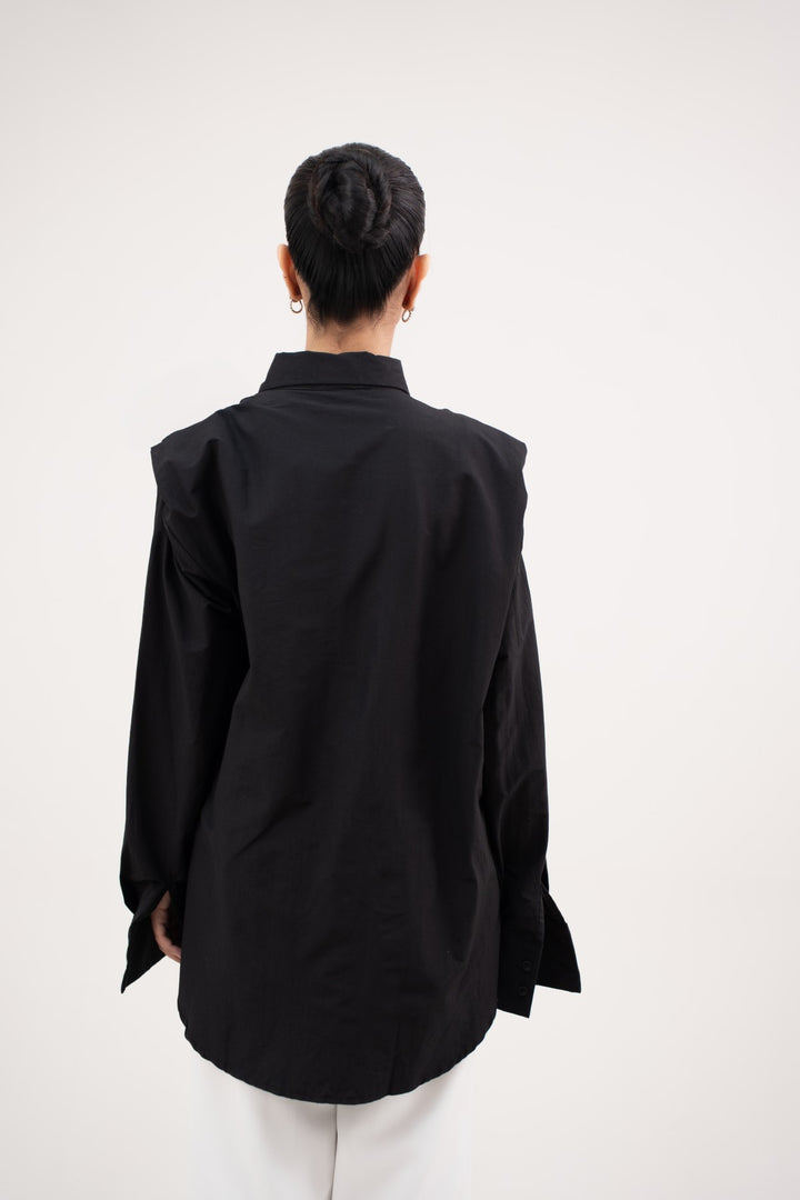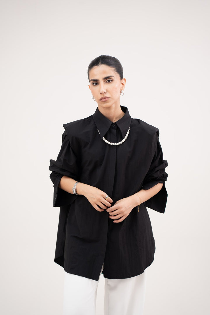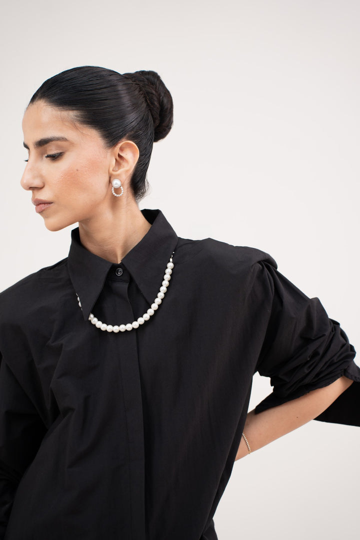 Cut from 100% cotton, this black shirt balances sharp lines with refined accents. A pearl-trimmed neckline draws the eye, framed by a crisp collar. The shoulders are structured with padding, giving the top a defined shape. Long sleeves taper into buttoned cuffs, while the concealed front fastening keeps the surface uninterrupted. A rounded hem completes the piece, designed to fall neatly over any base.