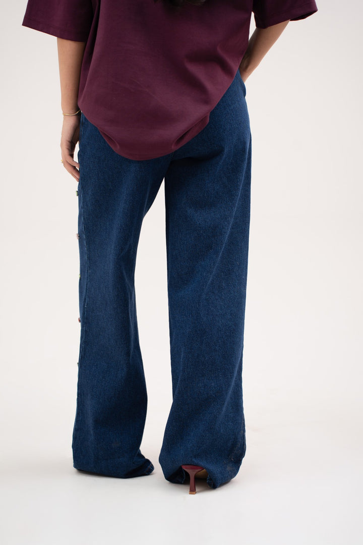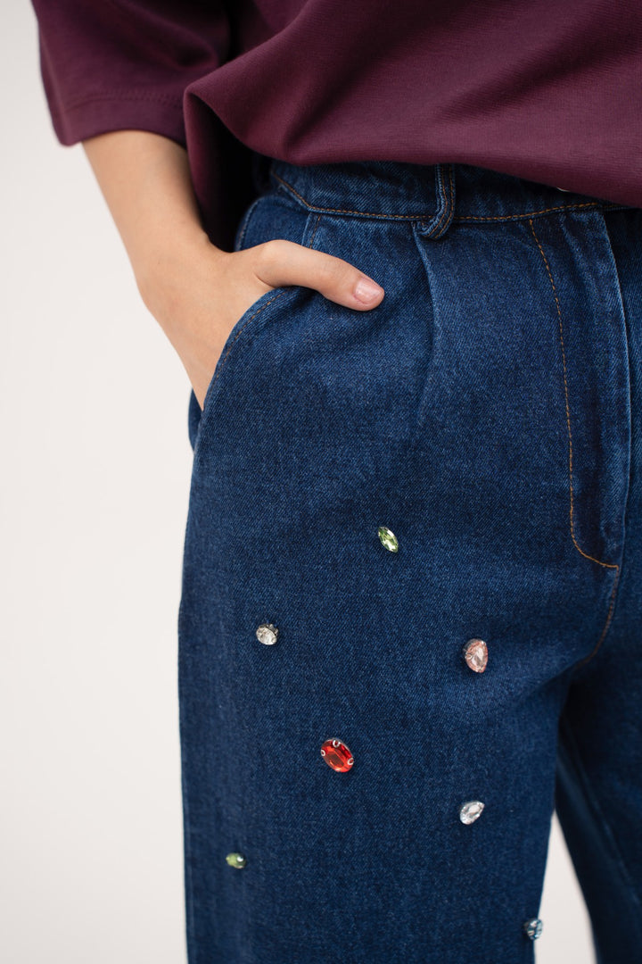These wide-leg trousers are made from 100% cotton denim for structure with ease. A single pleat runs through the front, giving shape without stiffness. The waist is finished with belt loops, a button, and a front zip for a classic close. Cross pockets add practicality, while the cut flows clean through the leg. Pair them with the beaded shirt for a coordinated look.100% cotton