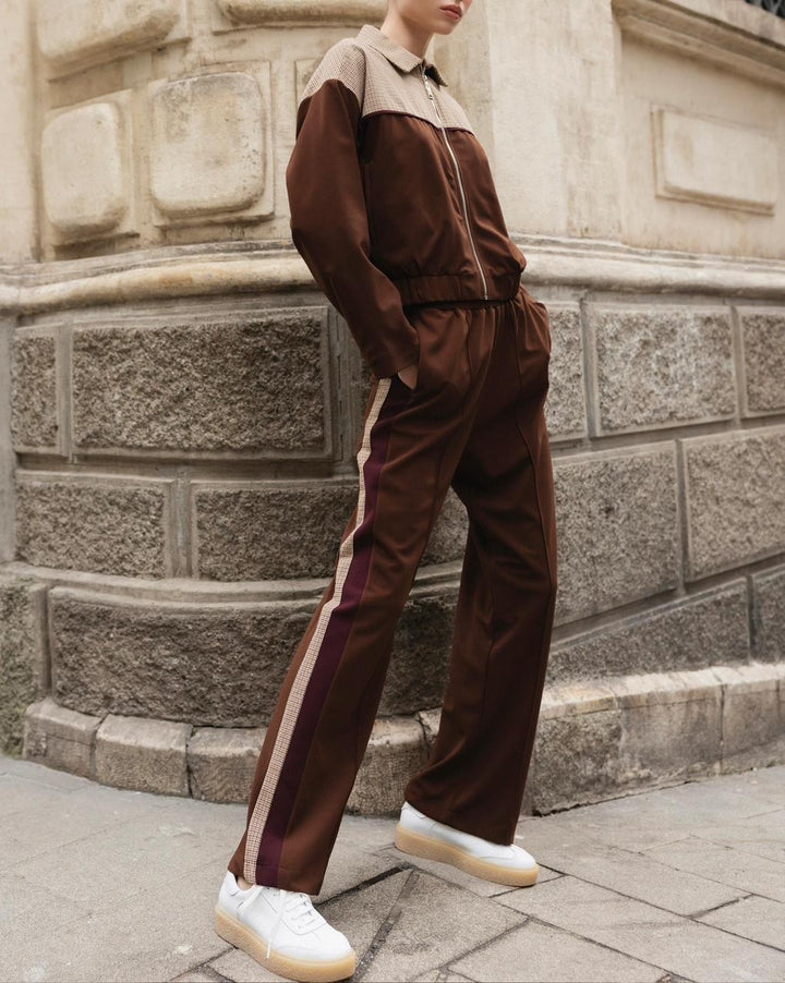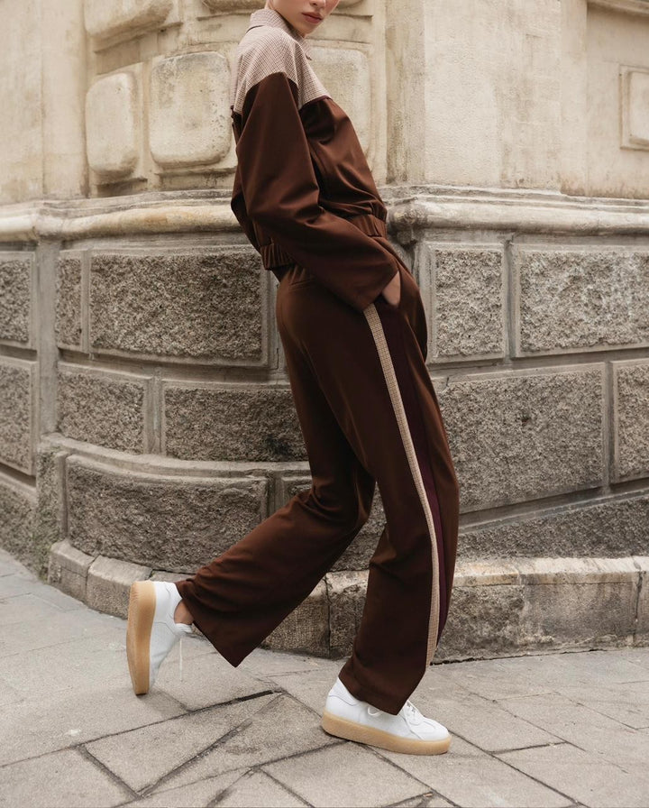 These trousers are cut in a relaxed fit for comfort and flexibility. Cross pockets at the front and pockets at the back add utility, while a checked lining along the sides ties the look back to the jacket. Designed for movement and ease, they complete the set with a coordinated finish.