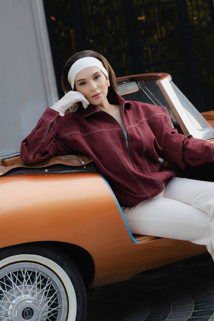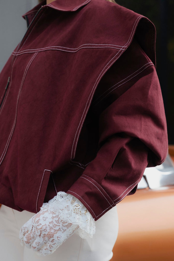 This Crimson Stitch Denim jacket in a deep burgundy color featuring a comfortable, relaxed fit. The construction is highly detailed, featuring a unique four-layered body - the inner section is fully finished with silk lining. The paneled body is defined by eye-catching contrast thread double stitching. It features a one-piece collar neck and a metal zip closure down the front. The jacket has drop shoulders and full sleeves finished with a pleat and cuff. The hem includes an elastic belt for shape and the front is completed with bon pockets on the sides.