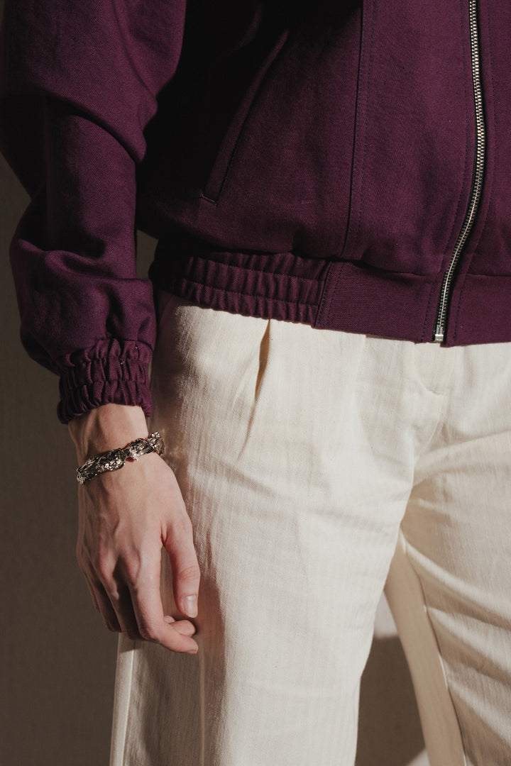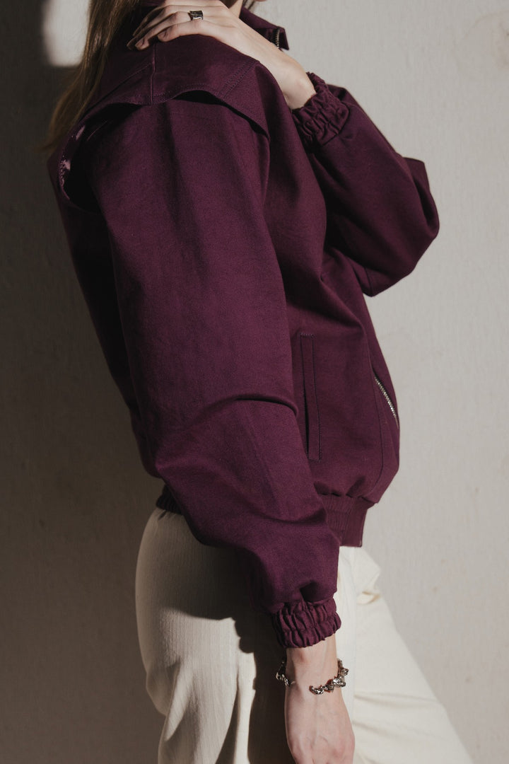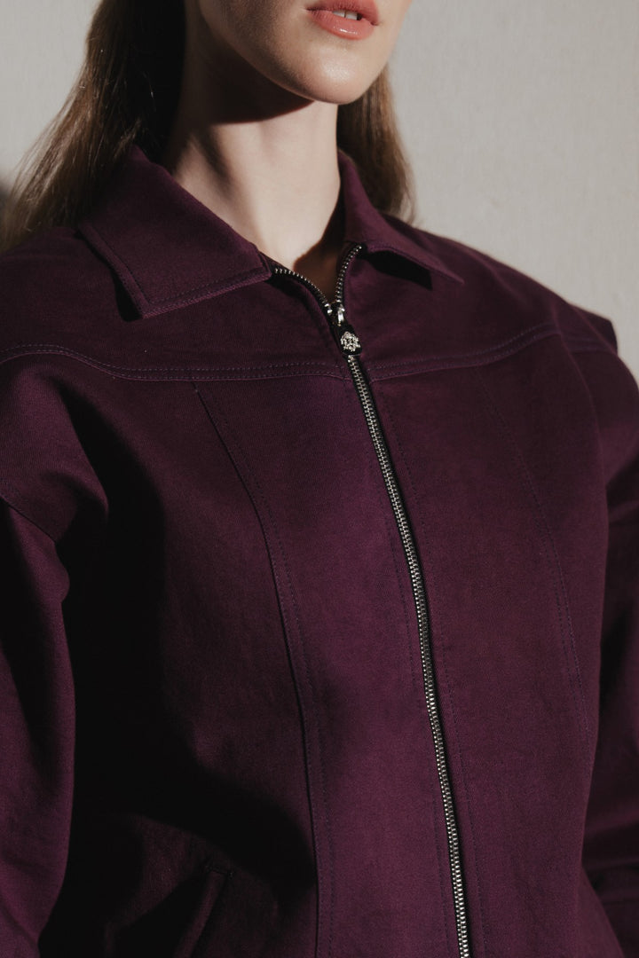 The Ebony Denim Jacket comes in a deep Mahogany color and features a relaxed fit. It has a four-layered body with a silk lining on the inner section. The jacket also features a collared neck (one-piece style) and fastens down the front with a metal zip. The paneled body is detailed with same-thread double stitching. It has drop sleeves that end in elastic cuffs, and the hem is shaped by an elastic belt. Functional bon pockets are included on the front sides.