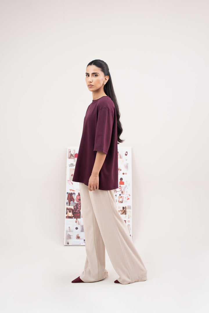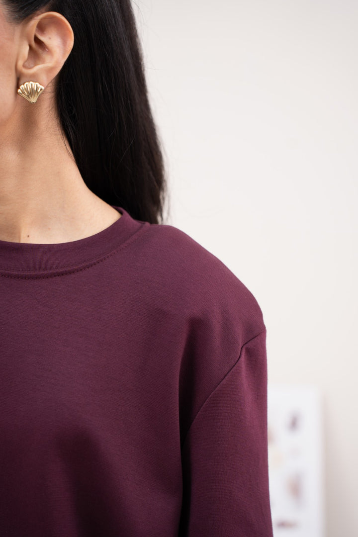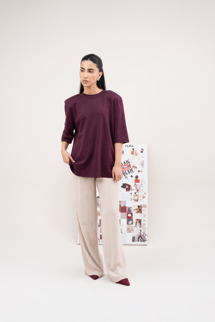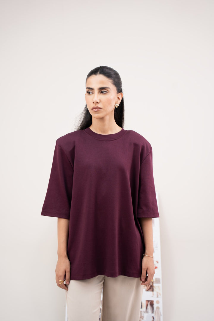 This maroon T-shirt takes a clean approach to everyday dressing. Cut from 95% cotton and 5% elastin, it sits easy on the body with just the right amount of stretch. Padded shoulders bring quiet structure, balancing the relaxed shape of the half sleeves and round neckline. A go-to piece for minimal style lovers, it proves that less really can do more.