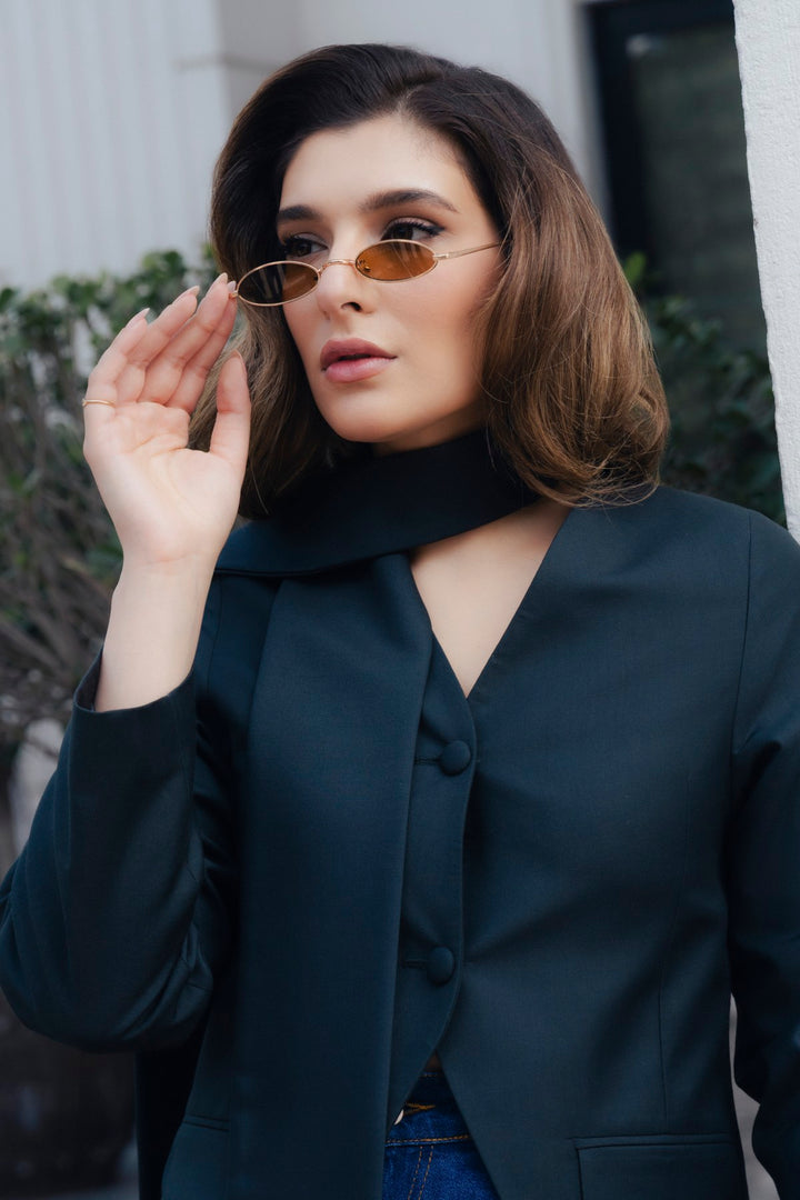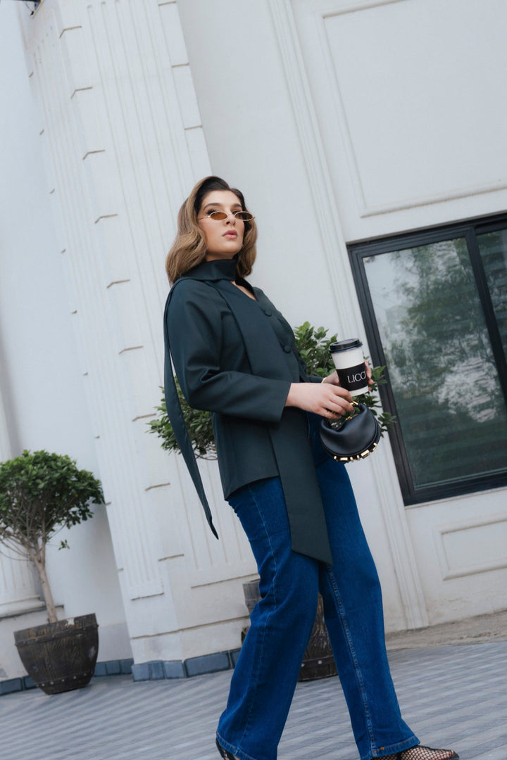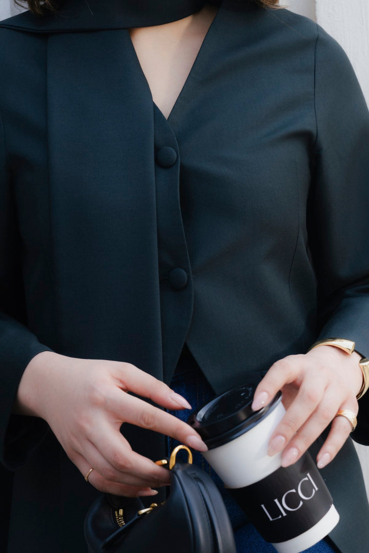 This Fern Contour Blazer comes in a rich charcoal grey color with a slim fit. The design includes a distinctive V-neck with a ban collar. The front is detailed with pleats and functional flap bon pockets and it fastens with self-fabric buttons on the placket. It is fitted from the waist, then gently flares out to a slight A-line shape towards the bottom.