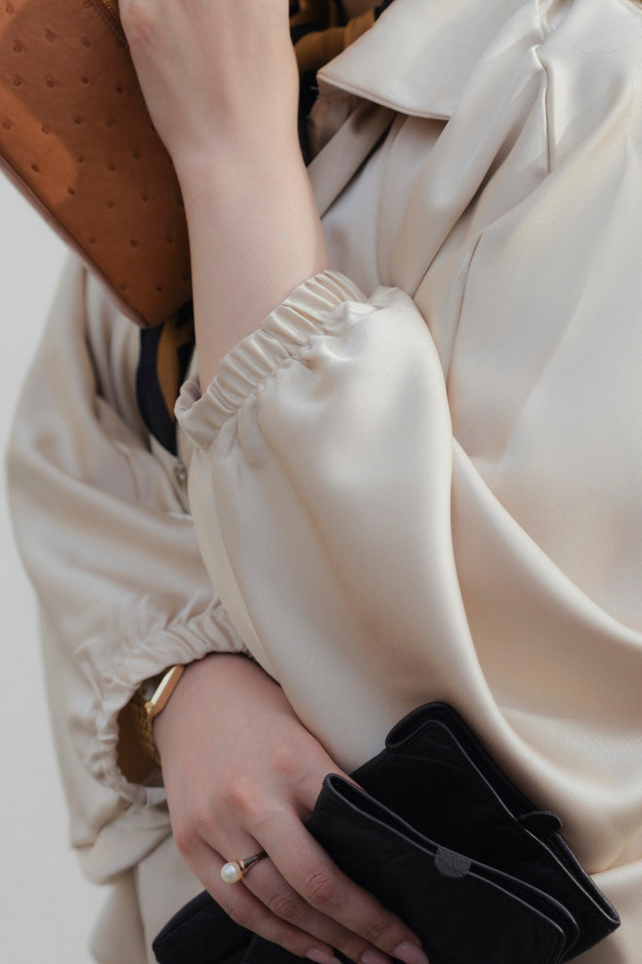 This silk top has shiny finish that drapes softly and reflects light. It features a simple collared neck and fastens with a full-length metal zipper down the center front. The hemline has elasticated band that helps create a full blouse effect.