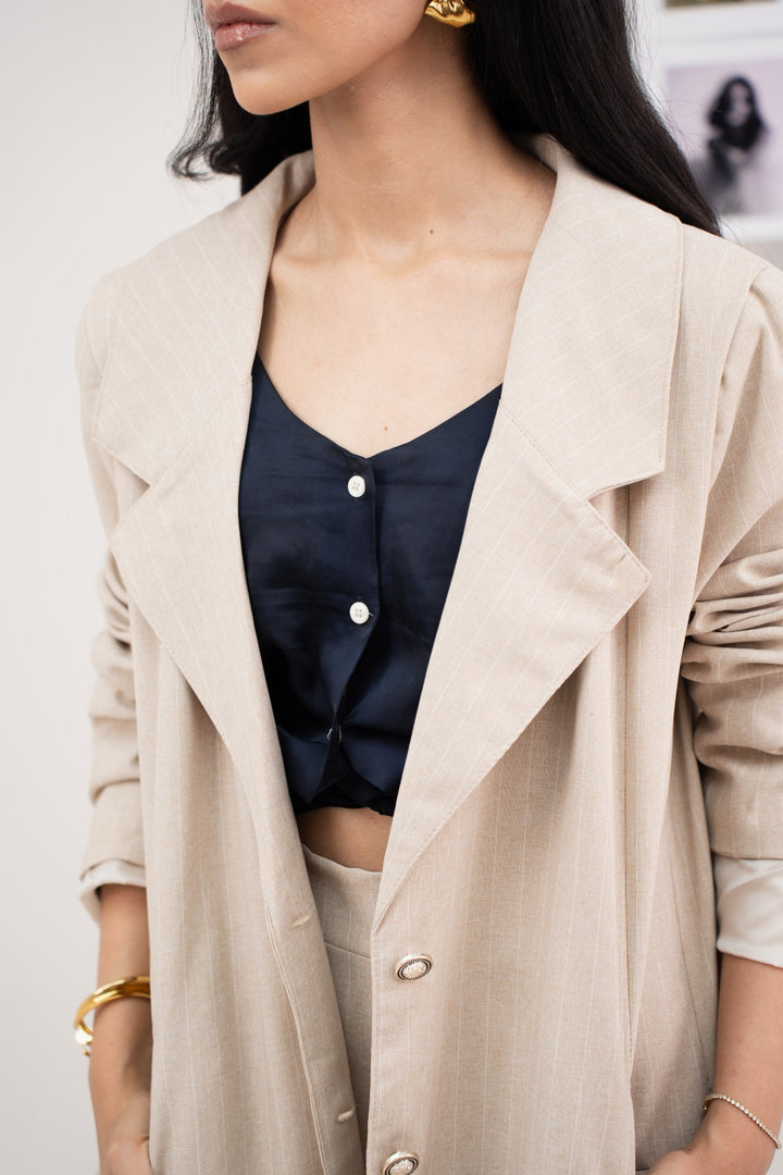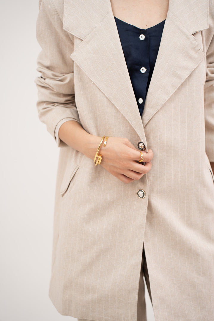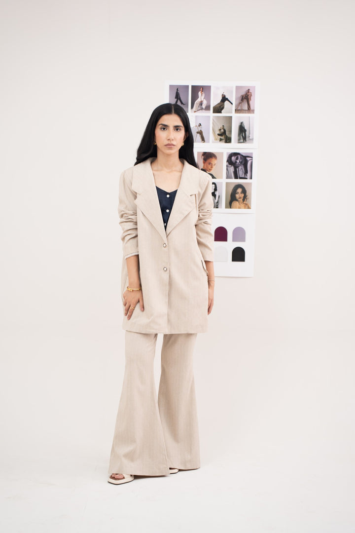 "This beige blazer is tailored from 100% polyester for a smooth and structured finish. A collared neckline, front buttons, and pockets keep the design classic and functional. The cut is versatile, easy to dress up or down depending on the setting. Pair it with the matching pants for a coordinated look that feels complete.