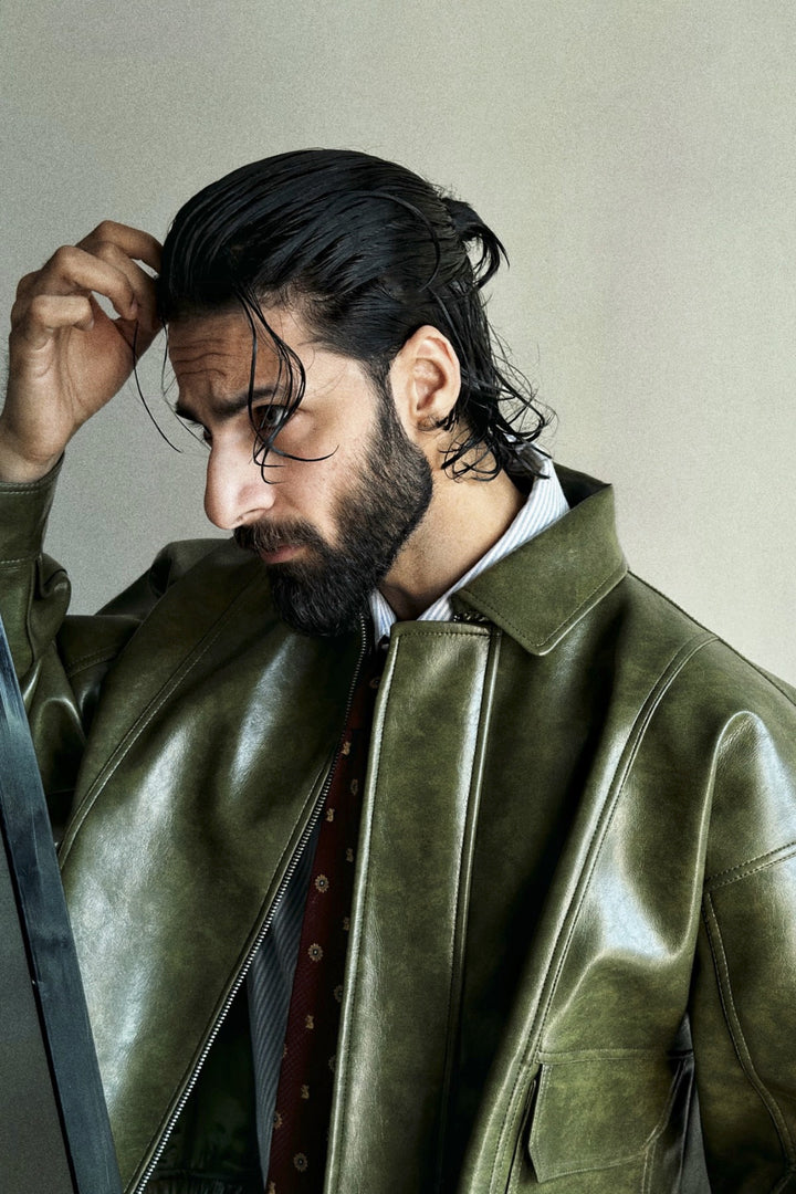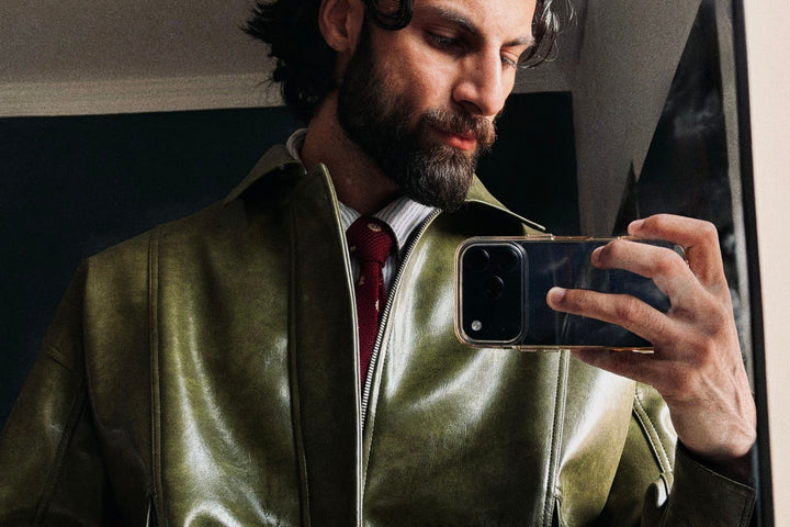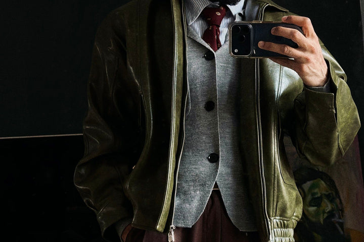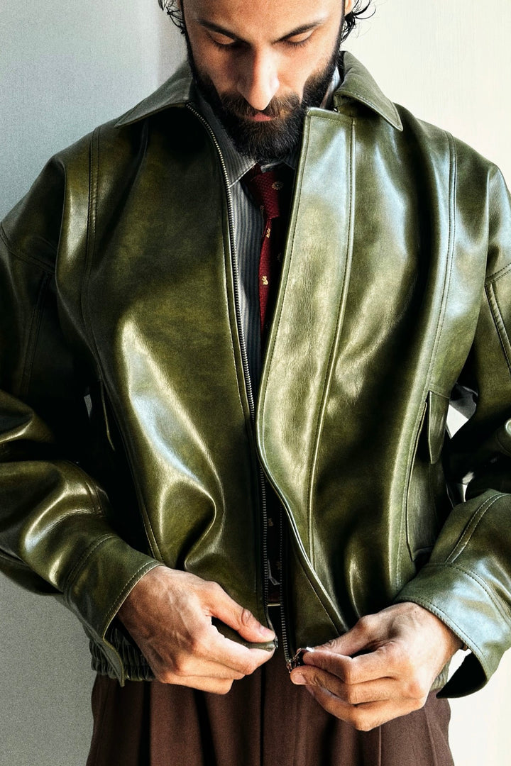 This Olive Snapper Jacket is a heavy coat with a relaxed fit, finished in a distinct olive green color. The material is a durable PU-coated Polyester blend, giving it a leather look. The jacket features a one-piece collar and full, paneled sleeves with drop shoulders. The front closes with a metal zip concealed by a flap that secures with a snap button at the top and bottom. Design details include front panels with top stitching and practical patch flap pockets on the front sides. The hem is finished with an elastic belt bottom.