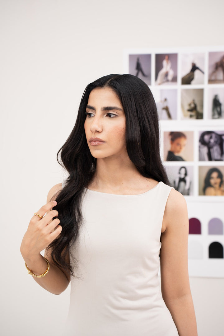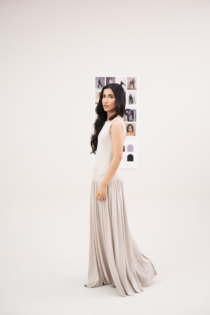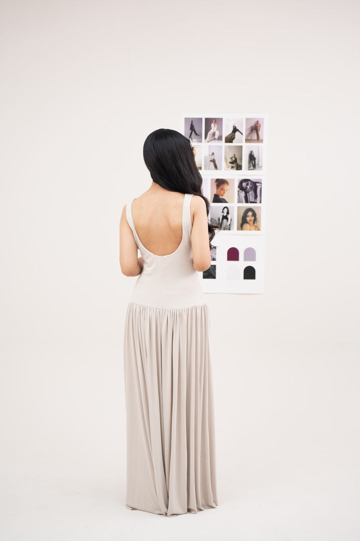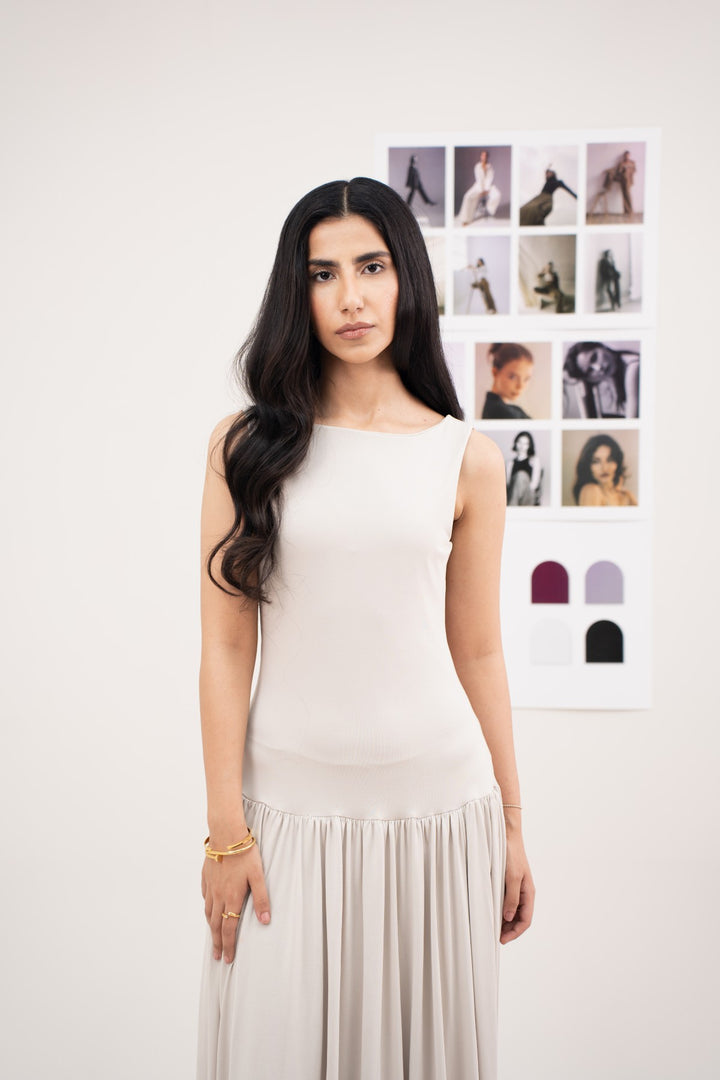 This grey sleeveless dress is made for ease and movement. Cut from 100% viscose, the fabric falls softly, creating a natural flow with every step. The neckline is wide and rounded at the front, opening into a deeper curve at the back. Subtle pleats begin at the waist, adding volume without weight. At 56 inches in length, it offers full coverage with a relaxed, comfortable feel.