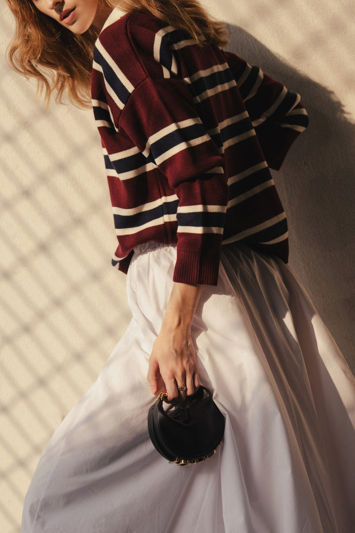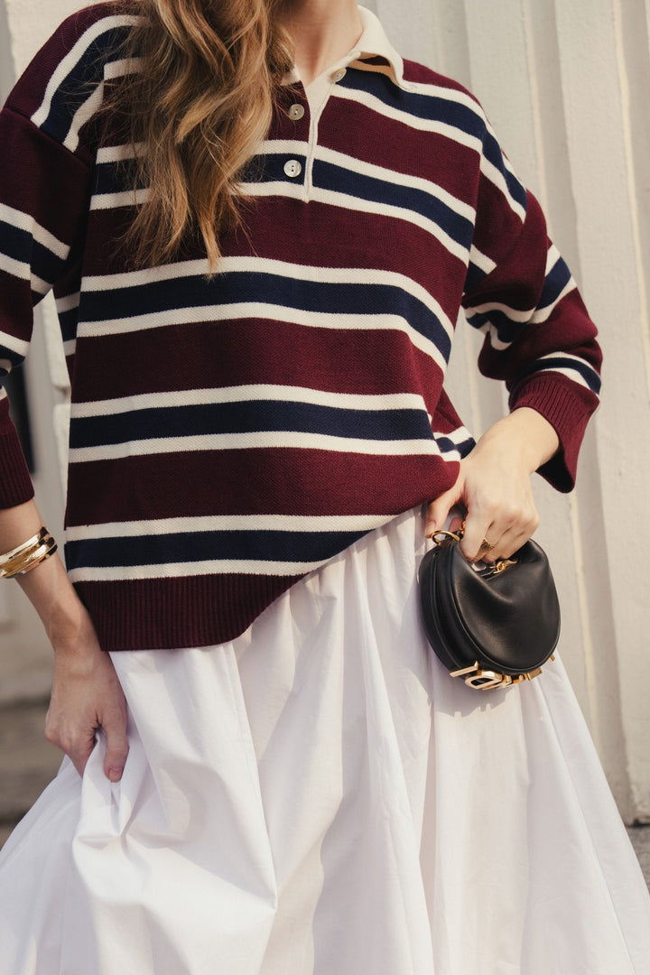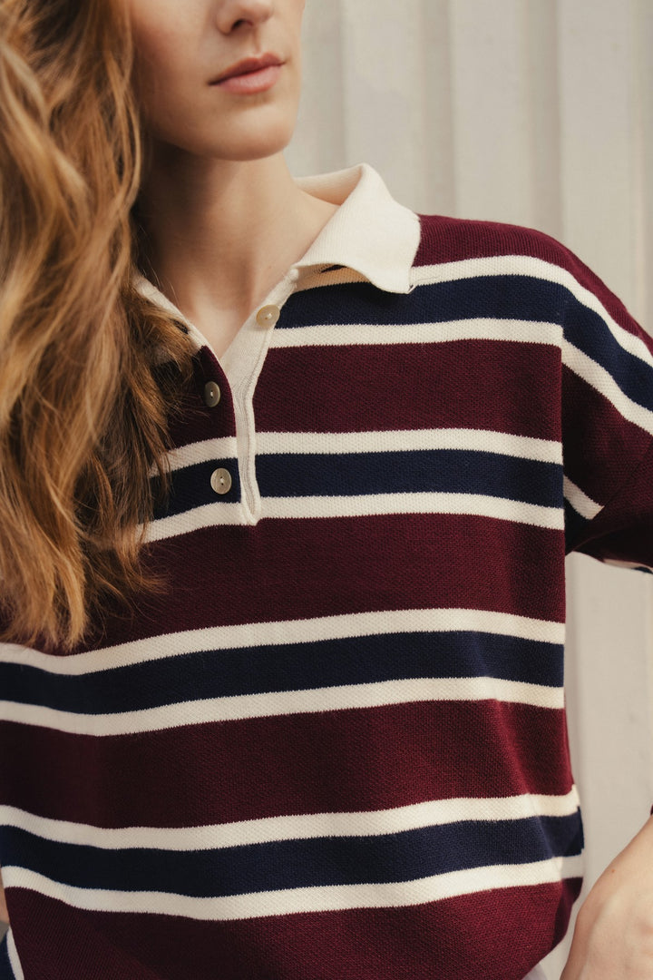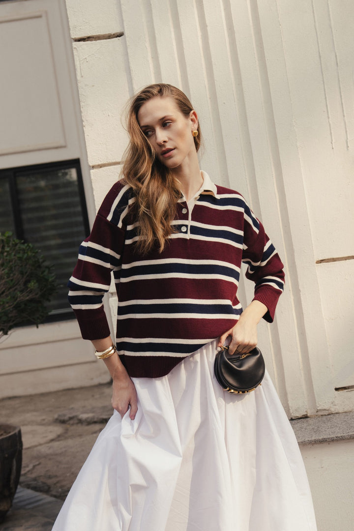 This sweater features a pattern of horizontal stripes in three distinct colors. It has a sporty design defined by a contrasting white, high-neck collar. Below the collar, there is a partial button-up placket secured by simple buttons. The fit is finished neatly with a ribbed hem and cuffs.
