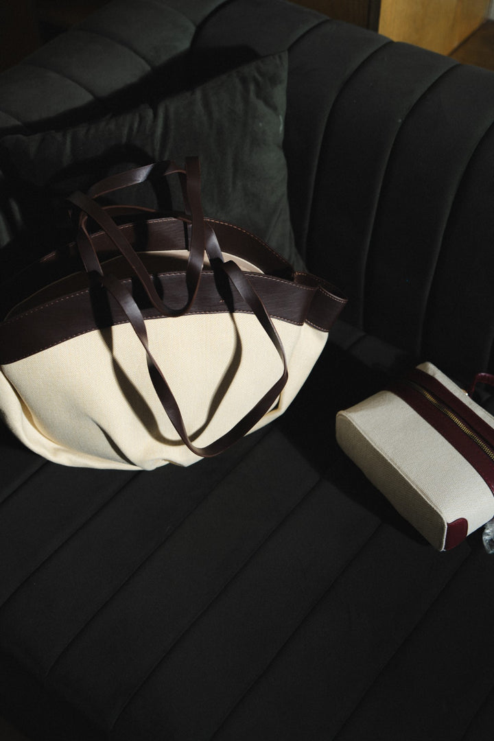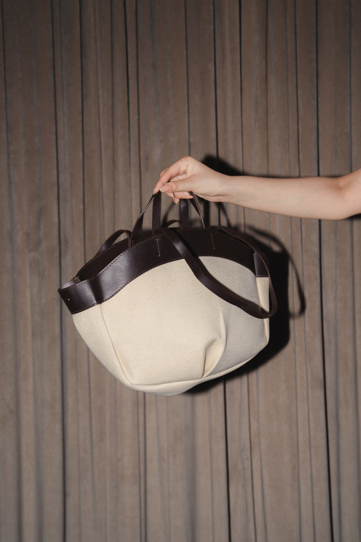 Introducing the Serina, a chic and contemporary tote designed for both style and function. This bag features a striking two-tone design, with a soft cream body beautifully complemented by smooth, dark brown trim and handles. Its unique, curved silhouette offers a fresh, modern aesthetic while providing ample space for all your daily necessities.